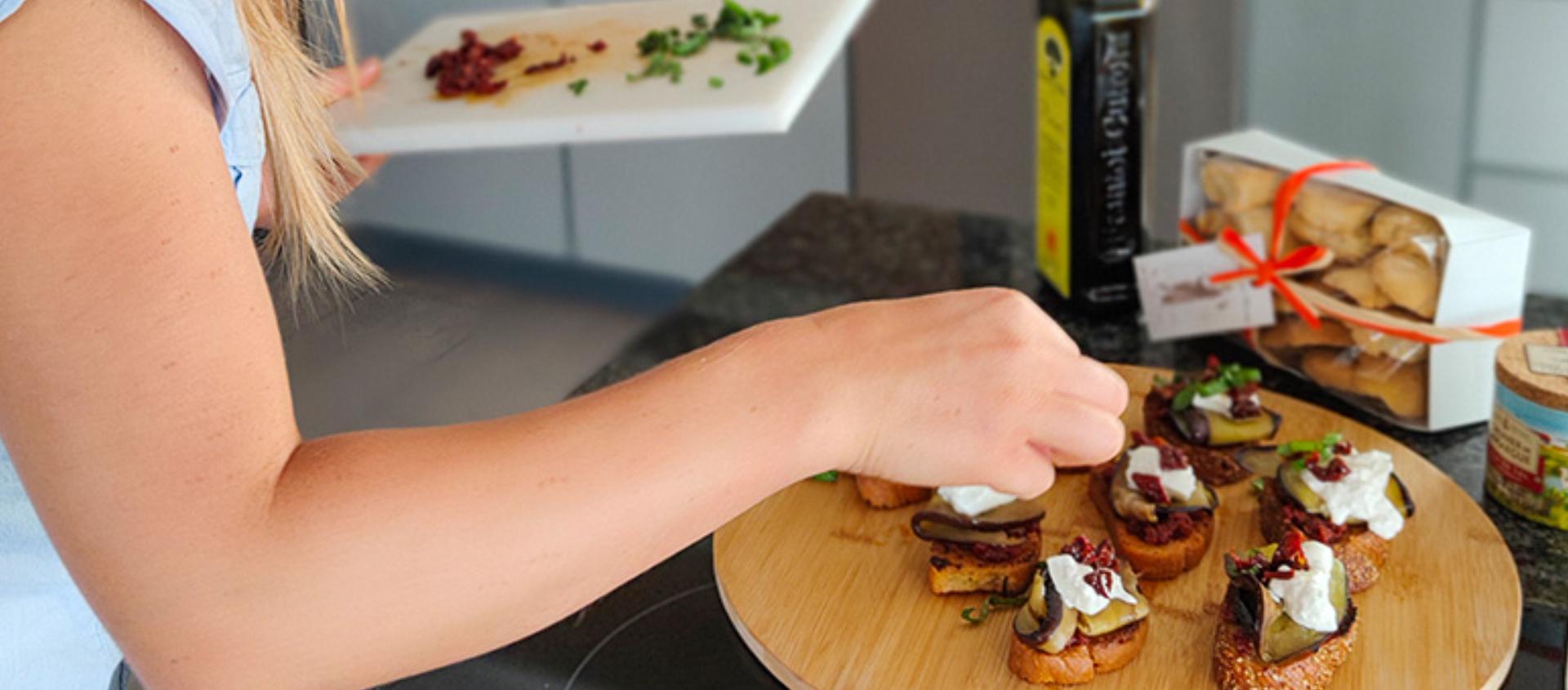 - Déposer une cuillère à café de patè sur chaque crostini. Déposer une tranche d'aubergine par-dessus. Couper la burrata et les tomates séchées en dés et répartir les deux sur les crostini. Pour finir, couper finement le basilic et le répartir sur les crostini. Saupoudrer de fleur de sel..