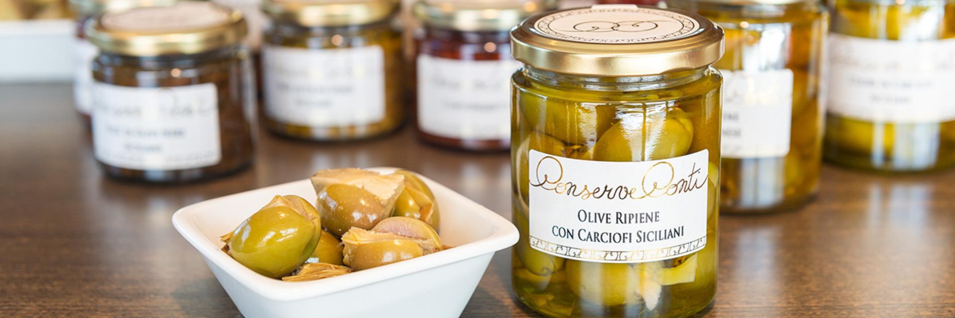 La gamme de produits de Conserve Conti est large et variée : olives, tomates, aubergines, poivrons et autres légumes sont transformés en délicieuses spécialités qui se prêtent merveilleusement bien à la préparation d'antipasti, de garnitures pour bruschettas ou tout simplement d'accompagnements. Bien entendu, ils proposent également des sauces et des pesti faits maison pour accompagner les pâtes fines, qui séduisent par leur goût intense et pur : sauces tomates aux olives, aux artichauts ou au basilic, pesto de tomates.